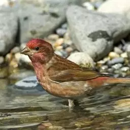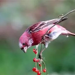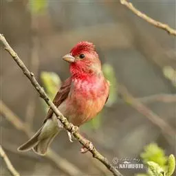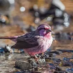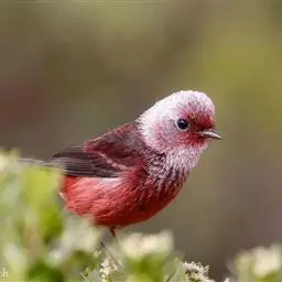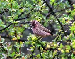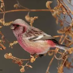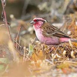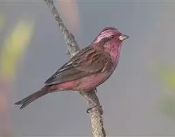 藏朱雀:全长约17-18厘米。雄鸟头部深红色具光辉,喉部暗红色具白色点斑;背部灰白色,各羽具玫瑰红…