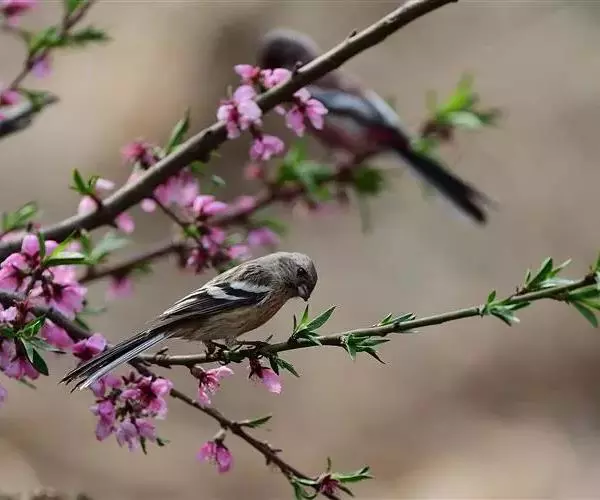 长尾朱雀(学名:Carpodacus sibiricus):体长18厘米,体重16-26克。雄鸟额、颏和眼后为暗红色,头顶与后颈的羽端较淡;翼羽具宽阔的白色边缘与先端;形成鲜明的翼斑;外侧尾羽白色,嘴短粗呈膨胀状;雌鸟无红色,头、颊到翕带灰色,具暗色斑纹;翼斑宽白;腰部橙褐色。