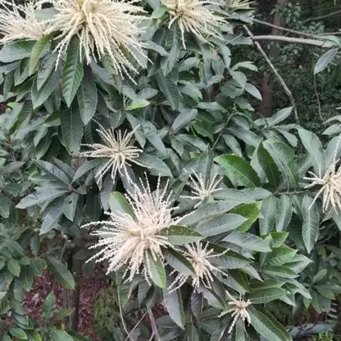 雄花序穗状或圆锥花序,花序轴无毛,花被片内面被疏柔毛;雌花的花柱3或2枚。果序轴横切面径2-5毫米;壳斗有1坚果,阔卵形,顶狭尖或钝,连刺径长20-30毫米,2-4瓣开裂,壳壁厚约1毫米,刺长6-10毫米,壳斗顶部的刺密集而较短,通常完全遮蔽壳斗外壁,刺及壳壁被灰白色或灰黄色微柔毛,若壳斗近圆球形,则刺较疏少,近轴面无刺;坚果阔圆锥形,顶部锥尖,宽10-14毫米,无毛,果脐位于坚果的底部。花期4-6月,果次年9-11月成熟。