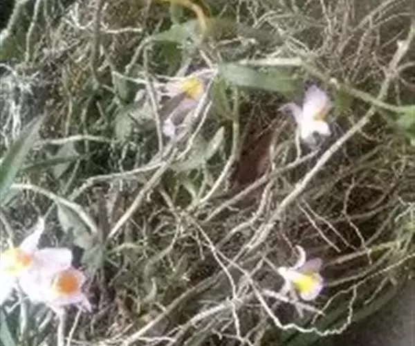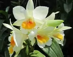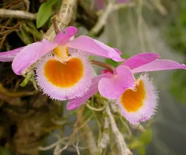美花石斛(学名:Dendrobium loddigesii Rolfe):茎柔弱,常下垂,细圆柱形,有时分枝,具多节;节间长1.5-2厘米,干后金黄色。叶纸质,二列,互生于整个茎上,舌形,长圆状披针形或稍斜长圆形。花白色或紫红色,每束1-2朵侧生于具叶的老茎上部;花瓣椭圆形,与中萼片等长,宽8-9毫米,先端稍钝,全缘,具3-5条脉;唇瓣近圆形,直径1.7-2厘米,上面中央金黄色,周边淡紫红色,稍凹的,边缘具短流苏,两面密布短柔毛。花期4-5月。
