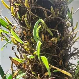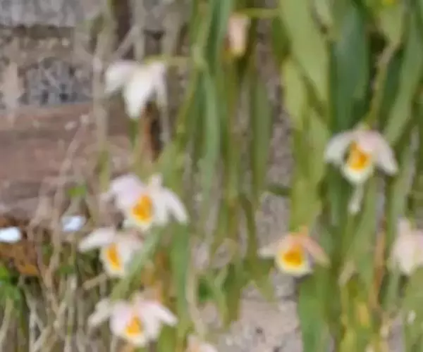 美花石斛茎柔弱,常下垂,细圆柱形,长10-45厘米,粗约3毫米,有时分枝,具多节;节间长1.5-2厘米,干后金黄色。叶纸质,二列,互生于整个茎上,舌形,长圆状披针形或稍斜长圆形,通常长2-4厘米,宽1-1.3厘米,先端锐尖而稍钩转,基部具鞘,干后上表面的叶脉隆起呈网格状;叶鞘膜质,干后鞘口常张开。