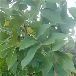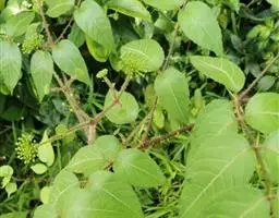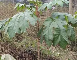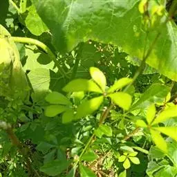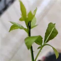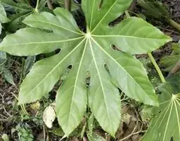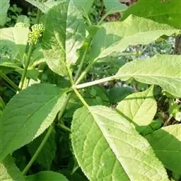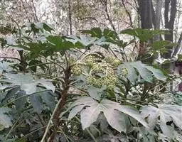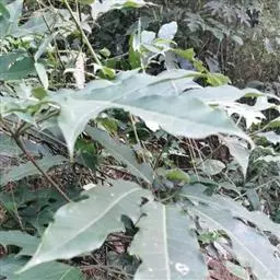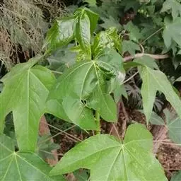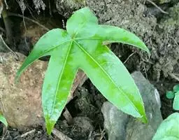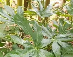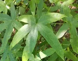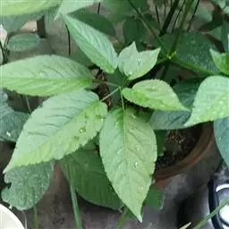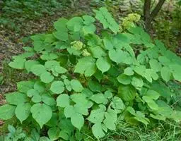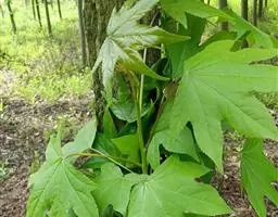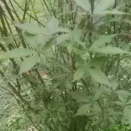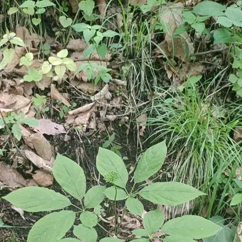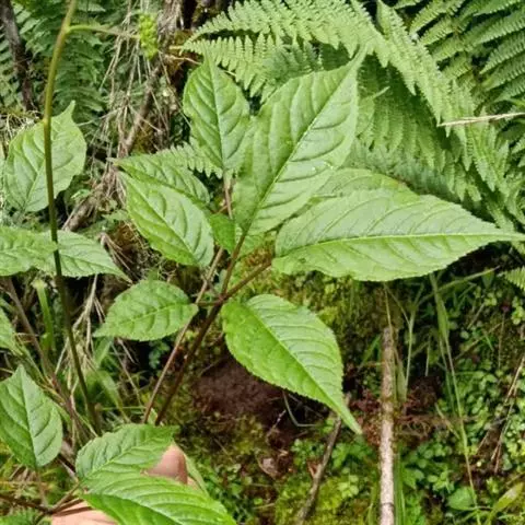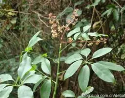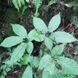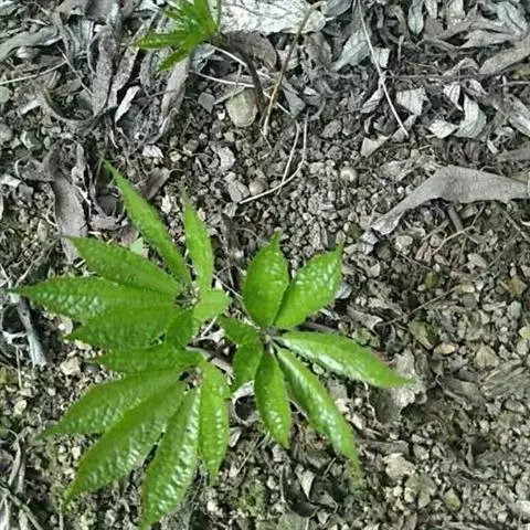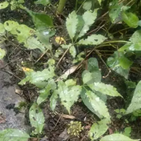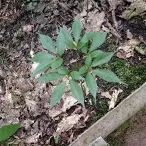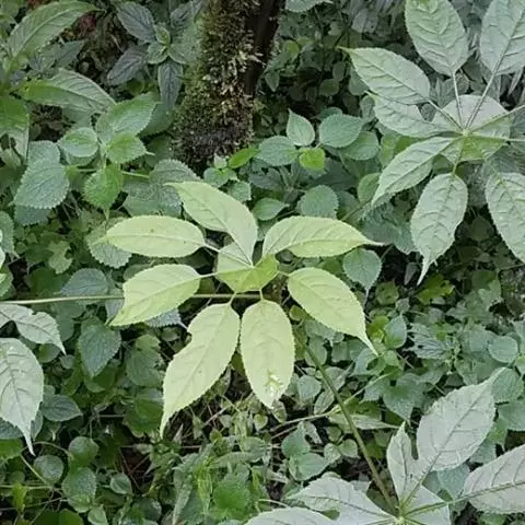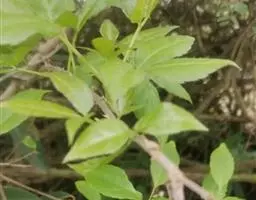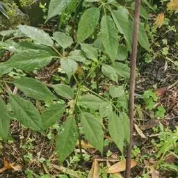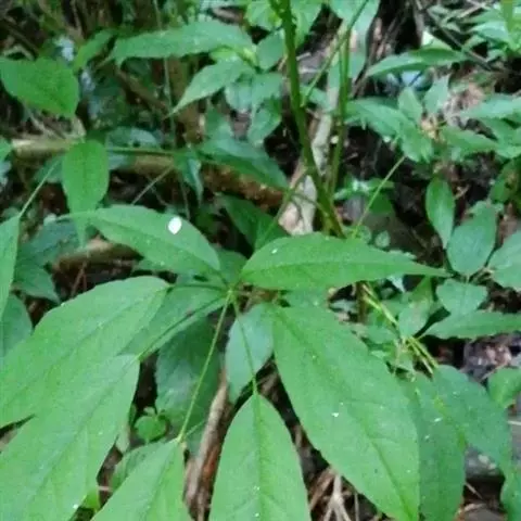 掌状5出复叶,通常3~4枚,轮生于茎端;叶柄长5~7cm;小叶片膜质,广卵形至倒卵形,长4~9cm,宽2.5~5cm,先端突尖,边缘具粗锯齿,基部楔形,最下两小叶最小;小叶柄长约1.5cm,最下二小叶柄较短或近于无柄。