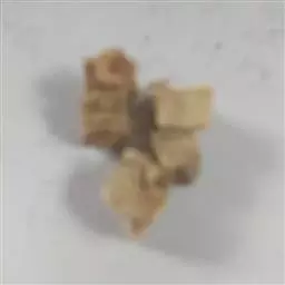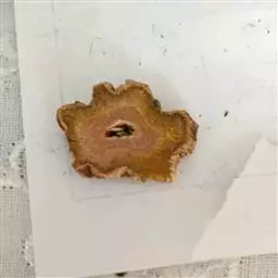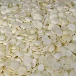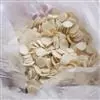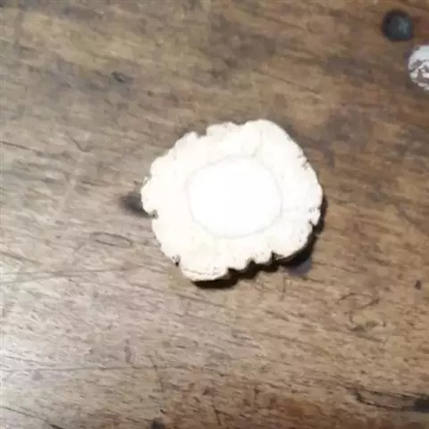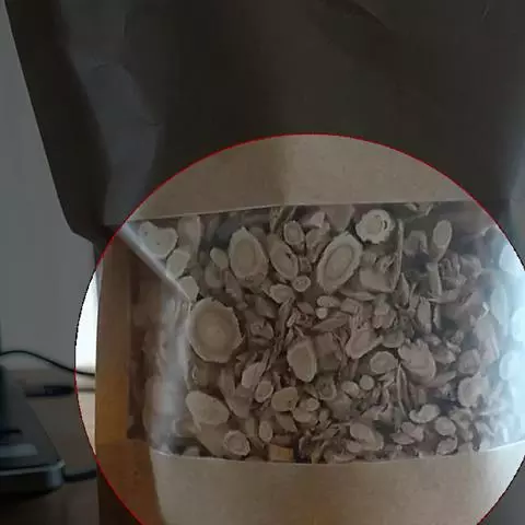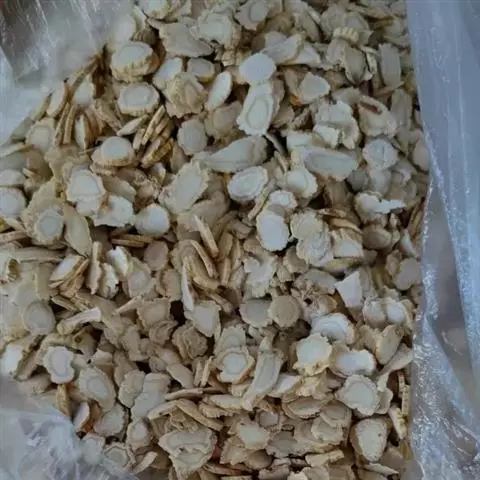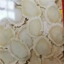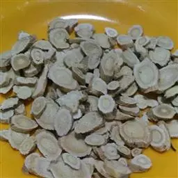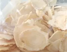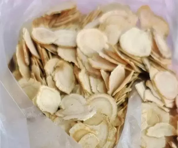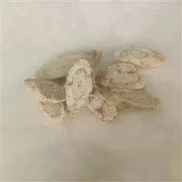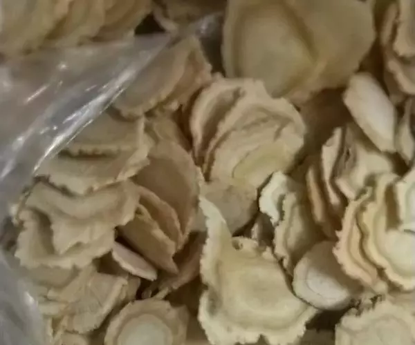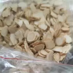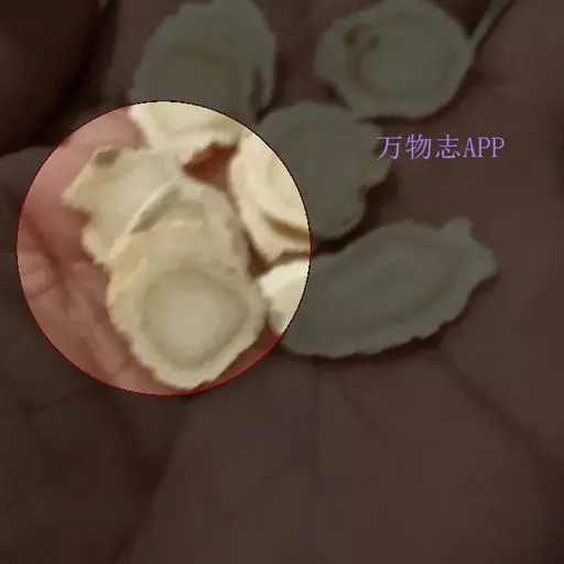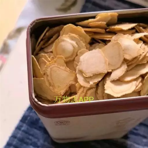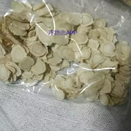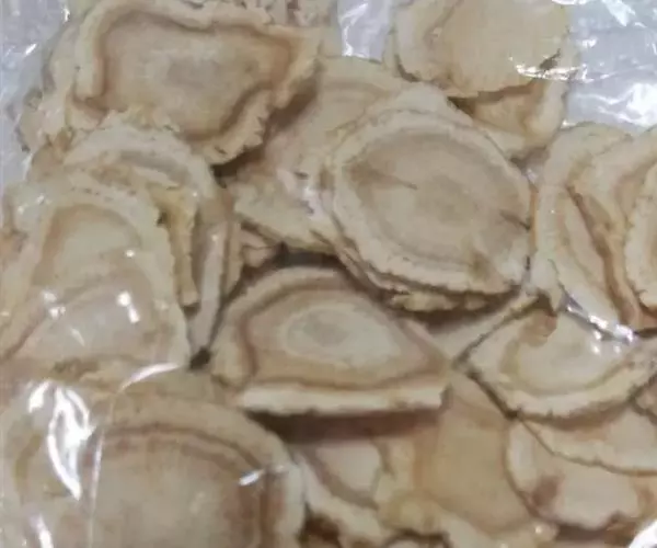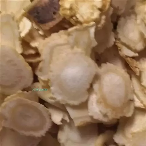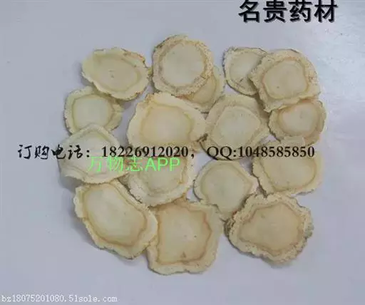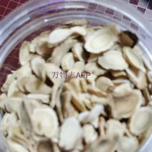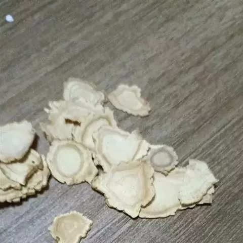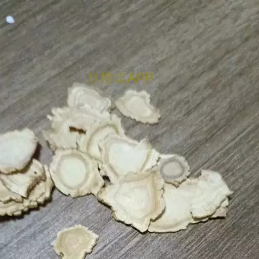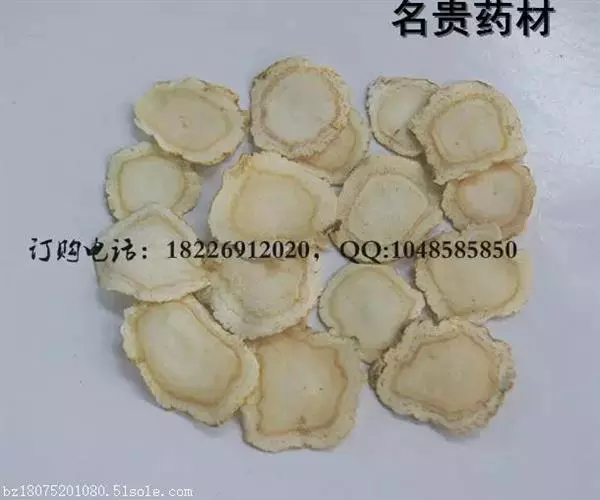 西洋参片 主根呈圆形或纺锤形,芦头残存或已除去,残存者,略偏向一侧;表面呈浅黄色或黄白色,皮纹细腻,具有突起的横长皮孔;质地饱满而结实。折断面略显角质,皮部与木部或中心常有小裂隙。断面呈粉白色,皮部可见一棕色形成层环,环内外散有红棕色小点;苦干味浓,透喉。