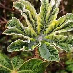 西洋参 感病叶片的背面,初期出现黄色孢子堆,最后逐渐扩大至全叶背面,使植株变黄干枯。