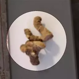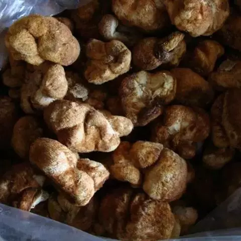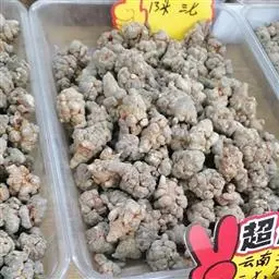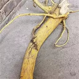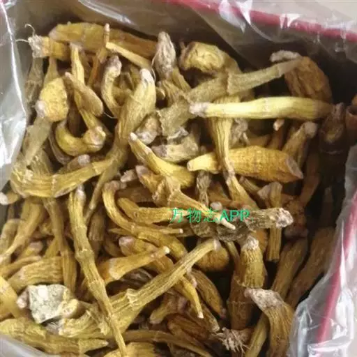 根茎长圆柱形或纺锤形,芦头多已除去;表面呈土黄色或黄白色,皮纹粗糙。横长皮孔粗而短;质地较脆而疏松,有放射状裂隙,皮部红棕色小点不明显;味淡,有甜味或豆腥味。