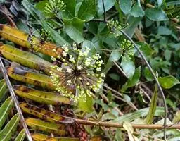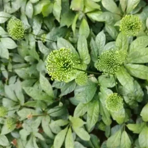 西洋参 总花梗由茎端叶柄中央抽出,较叶柄稍长或近于等长;伞形花序,花多数,花梗细短,基部有卵形小苞片1枚;萼绿色,钟状,先端5齿裂,裂片钝头,萼筒基部有三角形小苞片1枚;花瓣5,绿白色,矩圆形;雄蕊5,花丝基部稍宽,花药卵形至矩圆形;雌蕊1,子房下位,2室,花柱2,上部分离呈叉状,下部合生;花盘肉质环状。