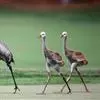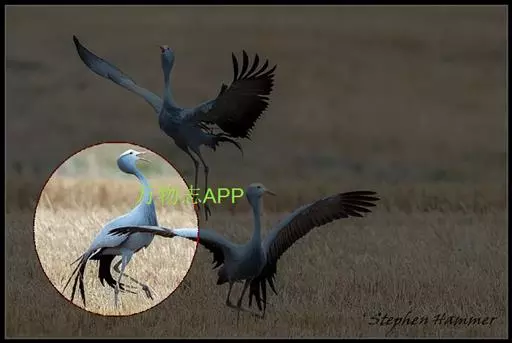 蓝鹤一般在春天筑巢孵蛋,通常一窝蛋只有两枚。有时这两枚蛋就直接产在光秃秃的地面上。但如果仔细观察,你会在蛋的底部发现一层不很明显的、薄薄的垫子。它是由干草、动物排泄物,甚至小石头等物构成的。在我观察过的一个鹤巢里,就发现有几百件这样的小东西。蓝鹤应该属于在繁殖期会变得特别醒目而漂亮的鸟类之一。而且看来在选址筑巢方面,它们显然十分粗心,过于草率。因为它们用于孵蛋的鸟巢总是筑在毫无遮掩的平地上。此外,它们全身的羽毛也毫无伪装。在这方面它们跟其他一些同样喜欢在平地上筑巢孵蛋的大型鸟类相比,如斯坦利的地鵏(Stanley’s Bustard),就大不一样。通常,人们在大约一公里之外就可以发现正在孵蛋的蓝鹤。