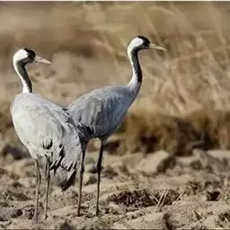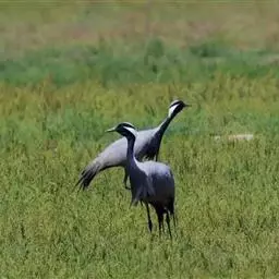 蓑羽鹤大型涉禽,体长68~92厘米,是鹤类中个体最小者。通体蓝灰色,眼先、头侧、喉和前颈黑色,…