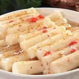 1、戴上手套,将山药洗净,去皮,切成1厘米见方、5厘米长的长条,用水浸泡,避免氧化发黑,用之前捞出沥干。枸杞用水泡软待用。