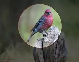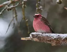 藏朱雀:全长约17-18厘米。雄鸟头部深红色具光辉,喉部暗红色具白色点斑;背部灰白色,各羽具玫瑰红…