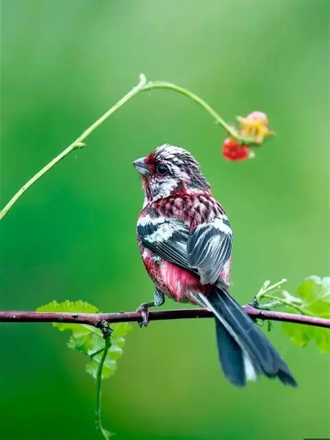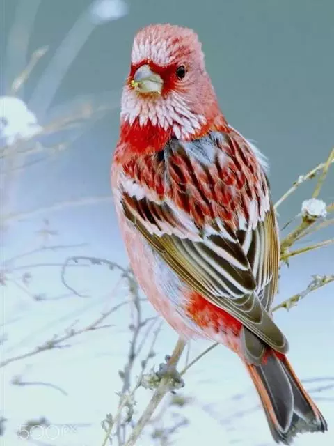 北朱雀,是燕雀科朱雀属鸟类。雄鸟额和头顶前部珠白色具窄的粉红色羽缘,…