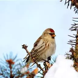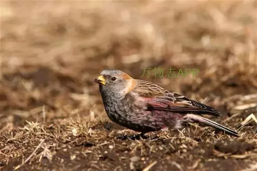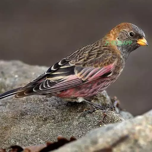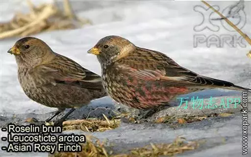 粉红腹岭雀(学名:Leucosticte arctoa):为燕雀科岭雀属的鸟类。体重25-34克,体长150-182毫米。是一种中等体型的深色岭雀。两翼及下体玫红色。东北亚种的雄鸟额、顶冠及脸灰;上背黄褐;上体深褐,沙色的羽缘成鳞状斑;两翼近黑而羽缘粉红;尾近黑而具白色羽缘;下体褐色,羽片中心粉红;冬季鸟的头顶、颈背及颈圈皮黄褐色。雌鸟较雄鸟色暗,两翼的粉红色仅限于覆羽。指名亚种成年雄鸟翼羽具宽阔的羽缘而使合翼时看似白色;体羽无粉红且腰及臀为浅色。与朱雀的区别在黄色的嘴较厚且头无粉红色。虹膜褐色;嘴黄色,嘴端黑色;脚黑色。