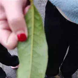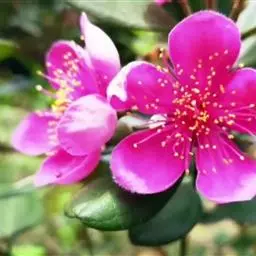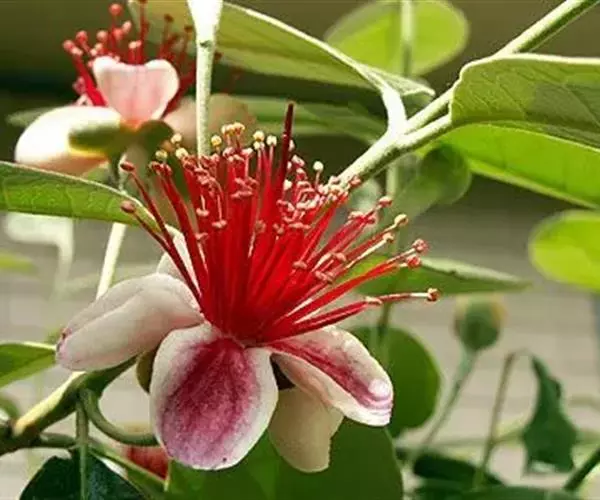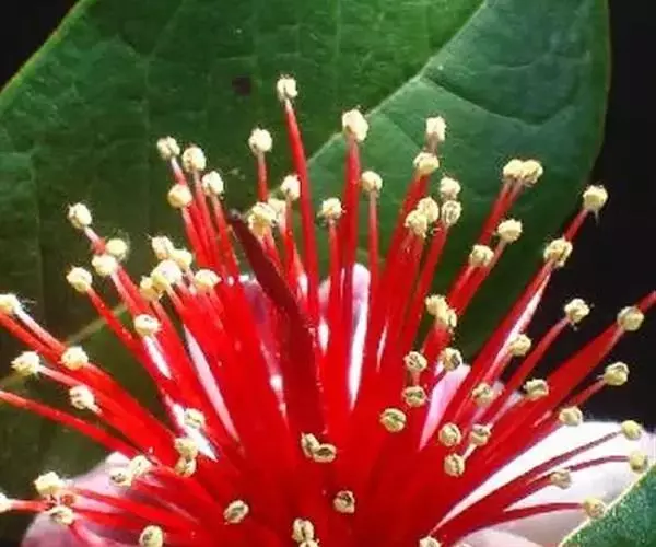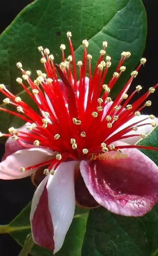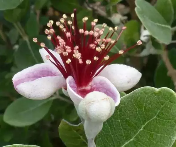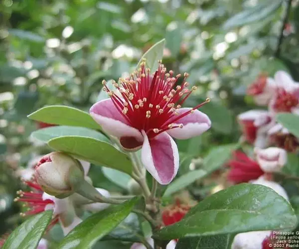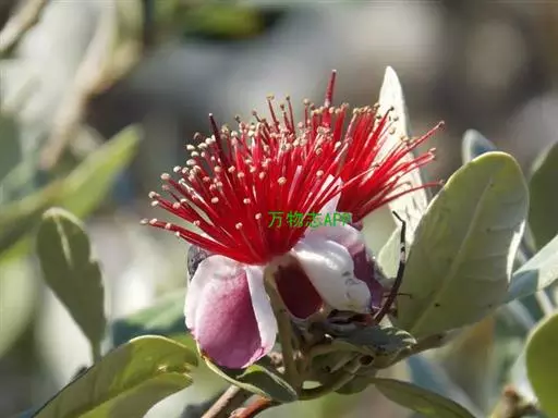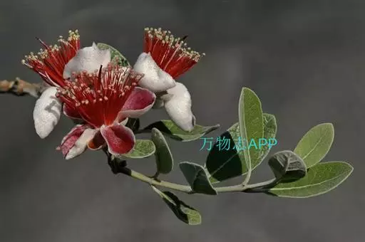 叶厚革质,椭园形对生,长5-7cm,深绿色,具油脂光泽,四季常绿。叶背面有银灰色细绒毛。枝叶修剪时散发出令人愉快的芳香,有益人体健康。花单生,花辨倒卵形,紫红色,外被白色绒毛。花两性,雄蕊和花柱红色,顶端黄色,花色艳丽,且可食用。
