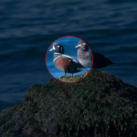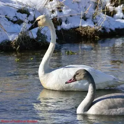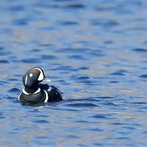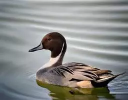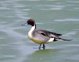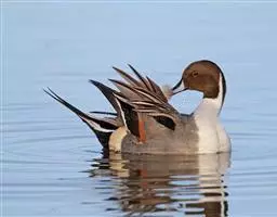 针尾鸭:头深褐色,颈侧与下体连成鲜明白色,翼镜为暗铜绿色,中央尾羽延长。