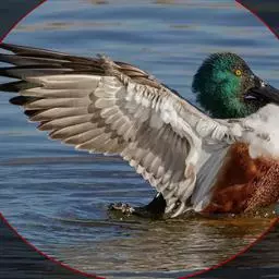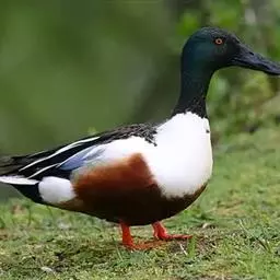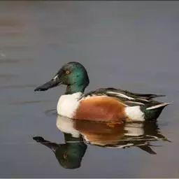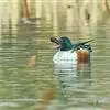 琵嘴鸭:嘴前端扩大成铲状,头颈黑紫色,胸白,翼镜绿,腹红褐。