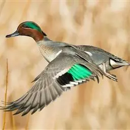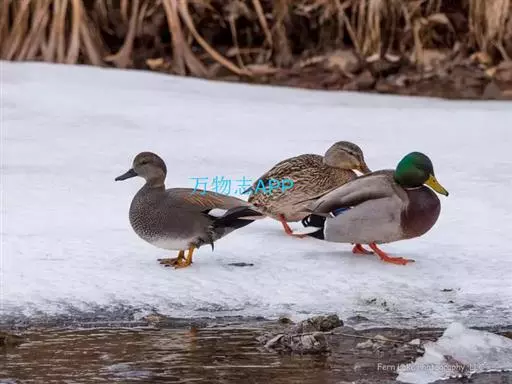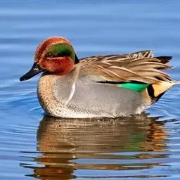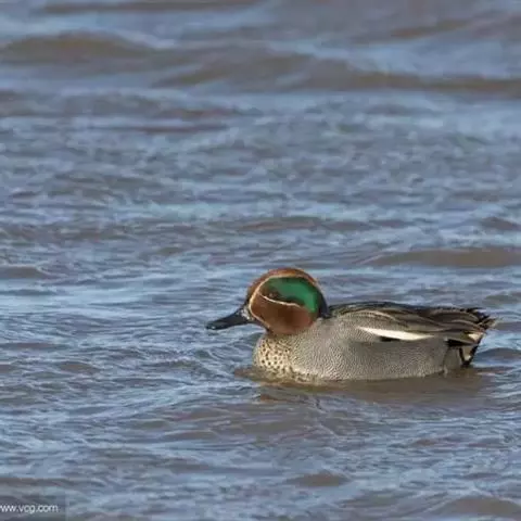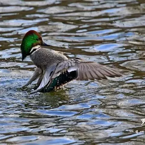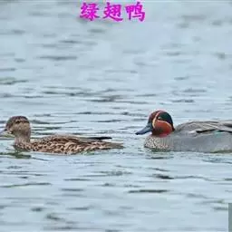 绿翅鸭:体小,翼镜金属绿色,头部深栗,两侧有绿色带斑。