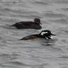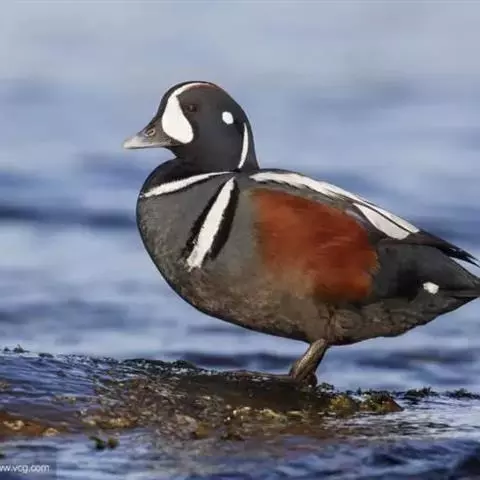 罗纹鸭:头顶栗色,头侧和头后的冠羽铜绿,喉纯白,前颈有一黑领,体羽发灰。