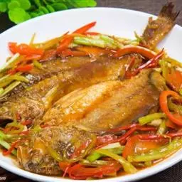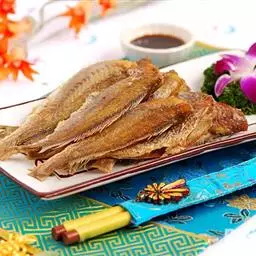 干烧小黄鱼 是由黄鱼等制作的食物,配料是葱、姜、蒜。