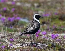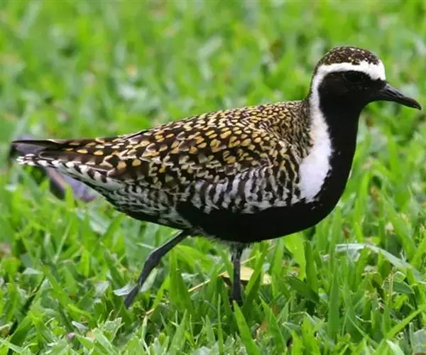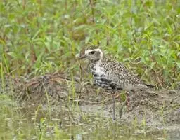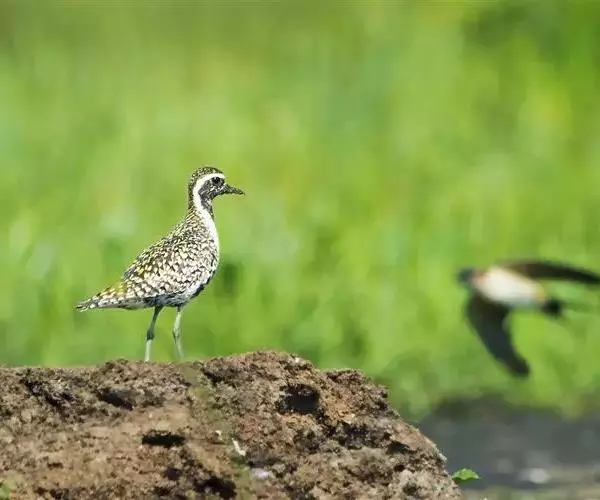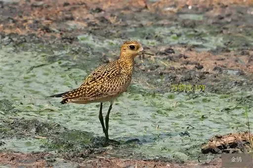 金鸻(学名:Pluvialis fulva):属中型涉禽。体重98-140克,体长230-252毫米。夏季全身羽毛大都呈黑色,背上有金黄色斑纹。翅膀又尖又长,飞行能力很强,秋天迁徒飞到很远的地方去越冬。跗蹠修长,胫下部亦裸出。中趾最长,趾间具蹼或不具蹼,后趾形小或退化。翅形尖长,第1枚初级飞羽退化,形狭窄,甚短小;第2枚初级飞羽较第3枚长或者等长。三级飞羽特长。尾形短圆,尾羽12枚。