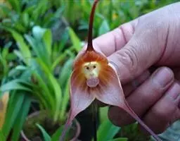 大花盆距兰 Kuntze):茎粗壮,长2-5厘米,节间长约1厘米。叶大,带状或长圆形。伞形花序侧生…