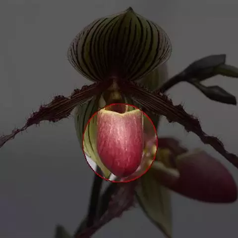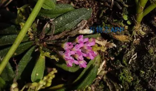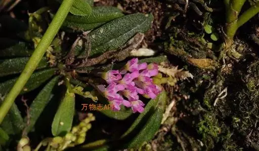 花瓣中部以下白色,上部洋红色,卵形,长2毫米,宽1.2毫米,先端钝;唇瓣3裂,分前后两部分;后部为侧裂片,直立,较大,半圆形,长2毫米,宽2毫米,与中裂片连接处具1个近球形的胼胝体;前部为中裂片,厚肉质,翘起,长约2毫米,上面中央隆起呈圆锥形,基部具可动的关节;距囊状,长约3毫米,基部上方弯曲,末端指向前;蕊柱黄色,粗短,长约1毫米;蕊喙很小,尖齿状,长约0.4毫米;药帽黄色,前端伸长并且翘起,先端近截形带3个尖齿;粘盘柄扁平,着生于粘盘中部,长约1毫米,宽0.3毫米;粘盘鳞片状,长2毫米,宽0.5毫米,两端锐尖。