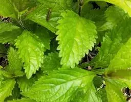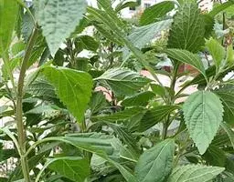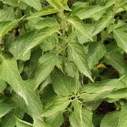 茎叶对生,卵圆形或菱状卵圆形,长2-6厘米,宽1.3-3厘米,先端锐尖或渐尖,后一情况顶端一齿较长,基部宽楔形,骤然渐狭下延成假翅,边缘具粗圆齿状锯齿,齿尖具胼胝体,膜质至坚纸质,上面榄绿色,疏被小疏柔毛及腺点,有时近无毛,下面淡绿色,密被灰白色短绒毛至近无毛,侧脉3-4对,两面十分明显,脉纹常带紫红色;叶柄连具翅假柄在内长1-3.5厘米,向茎、枝顶部渐变短。