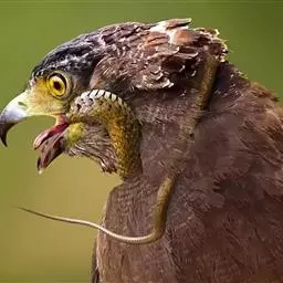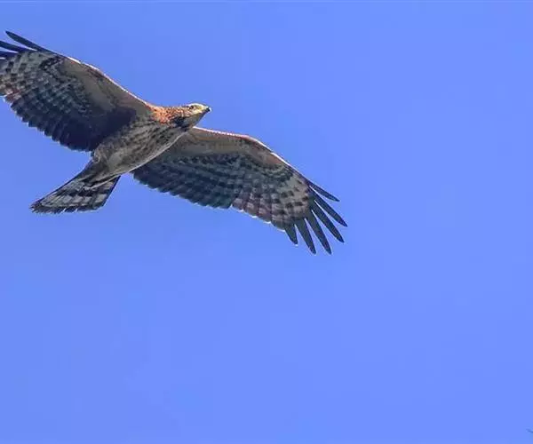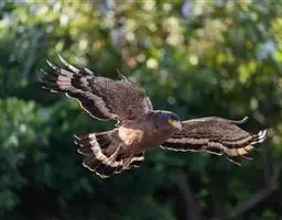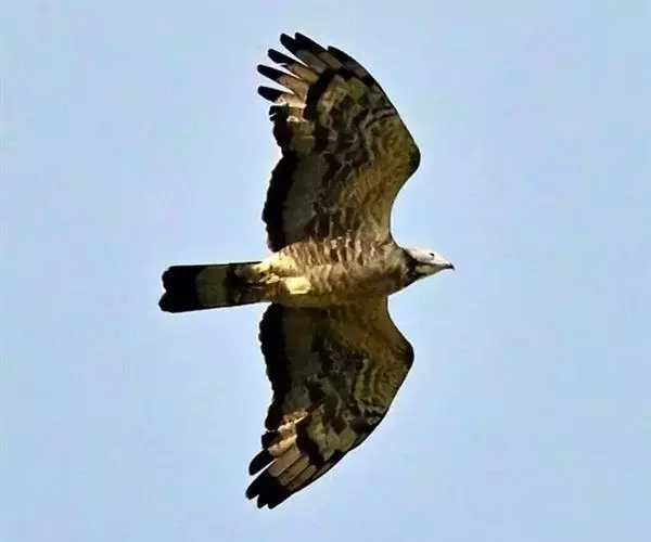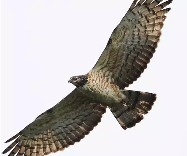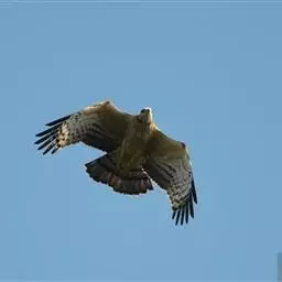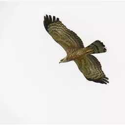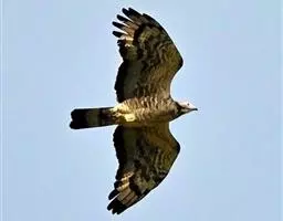 凤头蜂鹰(学名:Pernis ptilorhynchus):又称东方蜂鹰,共有6个亚种。体长为50-62厘米,体重800-1200克。头后及枕部羽毛狭长,形成短羽冠,常明显露出。上喙边端具弧形垂突,适于撕裂猎物吞食;基部具蜡膜或须状羽;翅强健,翅宽圆而钝,扇翅及翱翔飞行,扇翅节奏较隼科慢;跗跖部大多相对较长,约等于胫部长度。雌鸟显著大于雄鸟。具对比性浅色喉块,缘以浓密的黑色纵纹,并常具黑色中线。飞行时特征为头相对小而颈显长,两翼及尾均狭长。尤喜食蜂类,主要以黄蜂、胡蜂、蜜蜂和其他蜂类为食,也吃其他昆虫和昆虫幼虫,通常栖息于密林中,一般筑巢于大而多叶的树上,繁殖期为4-6月。每窝产卵约2枚。分布于中国、俄罗斯的西伯利亚南部至萨哈林岛,日本和朝鲜,越冬于菲律宾、马来西亚和印度尼西亚,部分留居于印度、缅甸、泰国、马亚西亚,非律宾和印度尼西亚。