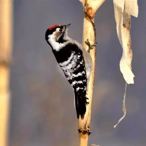 绒啄木鸟,北美洲最小的啄木鸟,白腹黑背和黑项,黑翼上有白色斑点。头部有黑白相间的条纹,尾巴短小,雄…