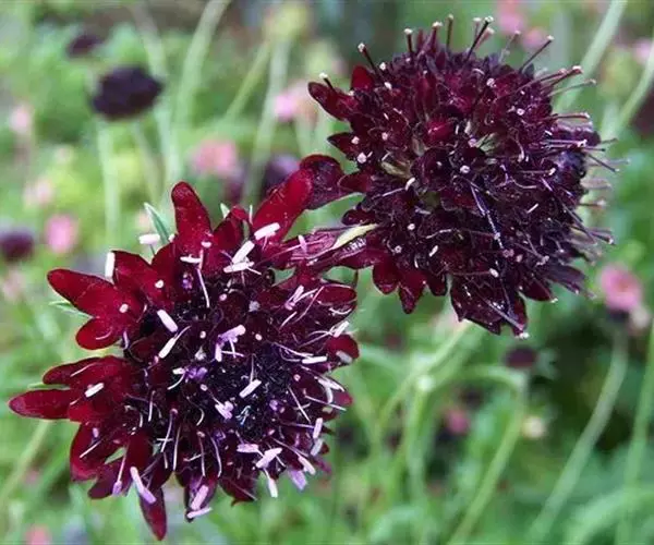 紫盆花(学名:Scabiosa atropurpurea Linn.)是川续断科蓝盆花属植物。一年生草本,高30-70厘米,茎多分枝,微具棱,棱上疏生白色卷伏毛。基生叶长圆状匙形;茎生叶对生,基部相连;叶片轮廓长圆形,长5-12厘米,宽3-7厘米。头状花序单生分枝顶端,圆头状,径4-5厘米。果序长卵形或长圆形,长4.5厘米,宽3.5厘米(连萼刺)。花期6-7月。