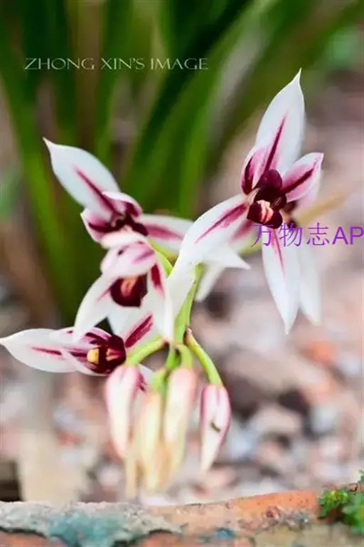 花葶自假鳞茎基部穿鞘而出,长18-35厘米,下弯或下垂;总状花序具5-9朵花;花苞片近三角形,长4-5毫米;花梗和子房长1-2厘米,后期继续延长;花直径4-5厘米,一般无香气;萼片与花瓣白色或奶油黄色,中央有1条栗色纵带自基部延伸到上部3/4处或偶见整个瓣片充满淡枣红色,唇瓣仅在基部和中裂片中央为白色,基余均为栗色,侧裂片则密具栗色脉,褶片呈白色或奶油黄色;萼片狭长圆状椭圆形,长2.2-2.7厘米,宽5-7毫米;