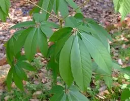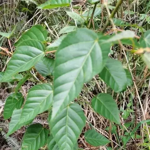 茶条木 灌木或小乔木高3-8米,树皮褐红色;小枝略有沟纹,无毛。叶柄长3-4.5厘米;小叶薄革质,中间一片椭圆形或卵状椭圆形,有时披针状卵形,长8-15厘米,宽1.5-4.5厘米,顶端长渐尖,基部楔形,具长约1厘米的柄,侧生的较小,卵形或披针状卵形,近无柄,全部小叶边缘均有稍粗的锯齿,很少全缘,两面无毛;侧脉纤细,两面略凸起。