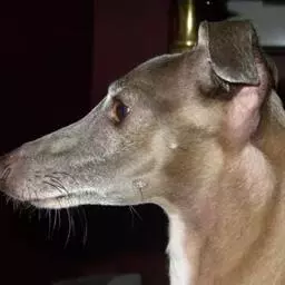 颅骨扁平,中等程度狭窄,自头顶向双眼逐渐变窄,头部没有过多的棱角,但从侧面看自额头到上颔部分较灰猎犬有更多的凹陷。可以看到虽然正前面部从眼到嘴逐渐变窄,下颔两侧稍向内倾斜,但其不会在眼下部分产生突然的变化,这些部位都相当丰满,像经过精雕细琢后呈现的“楔形”。比例适当的头部,其颅骨的长度和前脸的长度稍有不同,颊部扁平。
