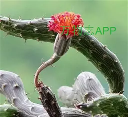 泥鳅掌 植株呈矮小的肉质灌木状,茎圆筒形,两头略尖,匍匐性,接触土壤即生根。平卧于地上,具节,每节长10~30厘米,直径1.5~2厘米,表皮灰绿或褐色,有深绿色线状纵条纹。叶线形,0.2厘米长,早干枯,但干枯后并不脱落,而是宿存在变态茎上,如同小刺。总花梗上有头状花序1~2朵,直径3厘米,花橙红或血红色。
