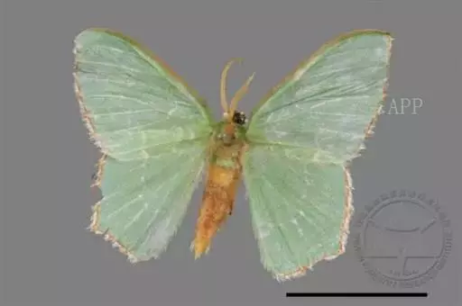 前翅长9mm。雄触角双栉形,雌锯齿形。下唇须短小细弱,红褐色。额红褐色。头顶和胸腹部背面黄白色。雄后足胫节具毛束,仅1对端距。翅黄绿色,隐见白色外线,波状;后翅外线中部外凸;前翅内线极弱或消失,有时可见极弱暗色中点;缘线鲜红褐色,在翅脉端间断;缘毛黄白色,在翅脉端红褐色,但在前翅顶角至 M2脉和后翅M2各脉端红褐色大部或全部消失。翅反面色较浅,缘线同正面。后翅外缘在M3处形成凸角,在M1处形成较小凸齿,2齿间凹。