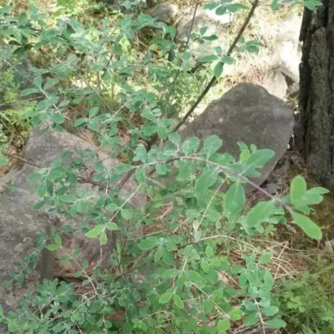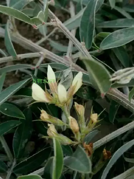 小灌木,高达1米。茎通常稍斜升,单一或数个簇生;老枝黄褐色或赤褐色,被短柔毛或无毛,幼枝绿褐色,有细棱,被白色短柔毛。羽状复叶具3小叶;托叶线形,长2-4毫米;叶柄长1-2厘米;小叶长圆形或狭长圆形,长2-5厘米,宽5-16毫米,先端圆形或微凹,有小刺尖,基部圆形,上面无毛,下面被贴伏的短柔毛;顶生小叶较大。总状花序腋生。较叶短或与叶等长;总花梗密生短柔毛;小苞片披针状线形,有毛;花萼5深裂,外面被白毛,萼裂片披针形,先端长渐尖,成刺芒状,与花冠近等长;花冠白色或黄白色,旗瓣长圆形,长约1厘米,中央稍带紫色,具瓣柄,翼瓣长圆形,先端钝,较短,龙骨瓣比翼瓣长,先端圆形;闭锁花生于叶腋,结实。荚果小,倒卵形或长倒卵形,长3-4毫米,宽2-3毫米,先端有刺尖,基部稍狭,两面凸起,有毛,包于宿存花萼内。花期7-8月,果期9-10月。 [1-2]
