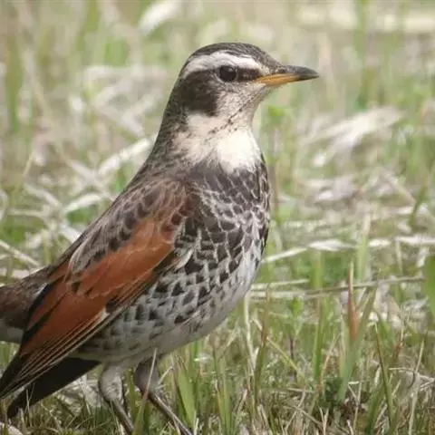 白眉歌鸫,是雀形目鸫科鸫属鸟类。体型略小并具有褐色斑点的歌鸫,上体橄榄褐色,眉纹白色,脸部斑驳,…