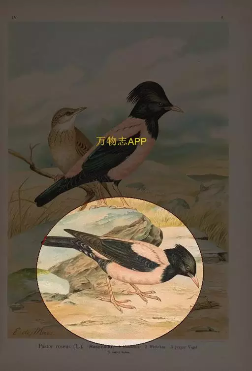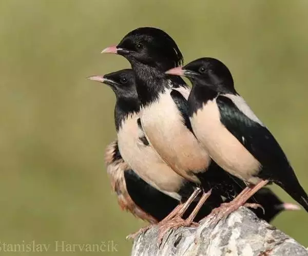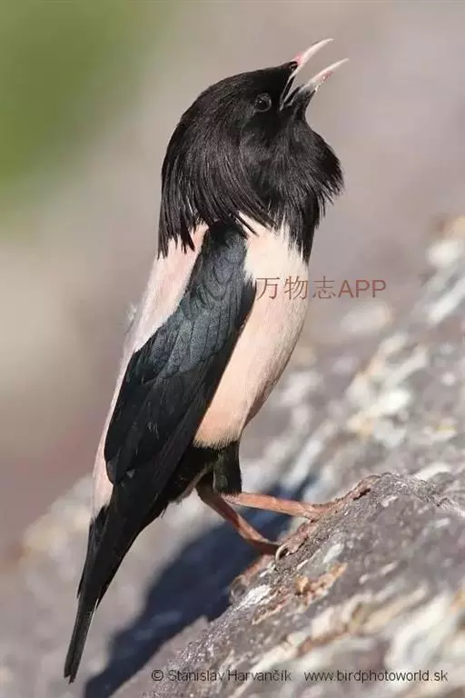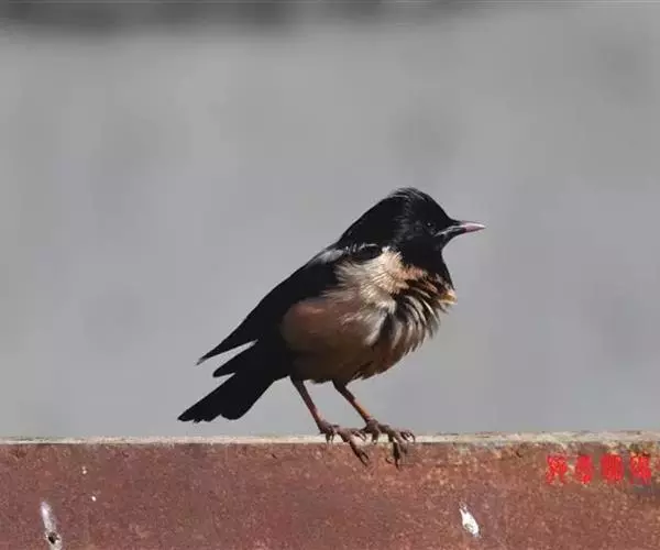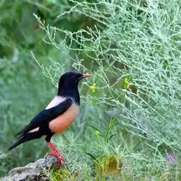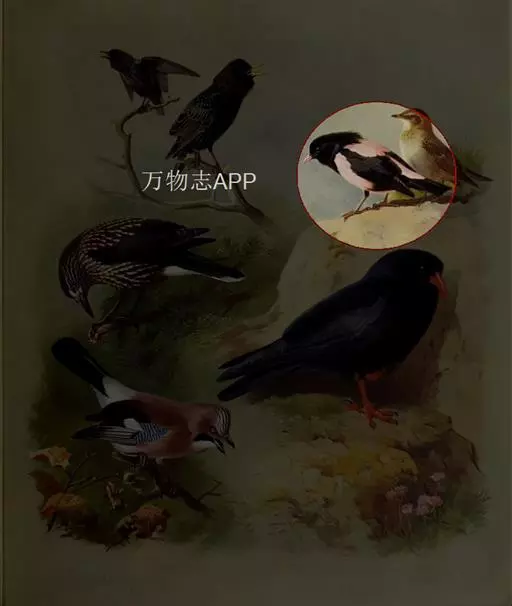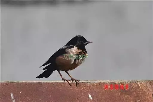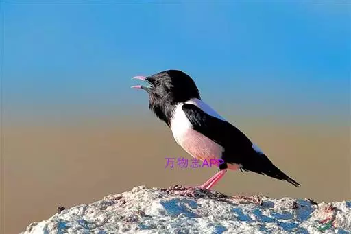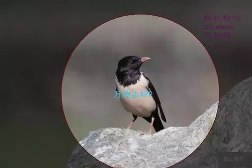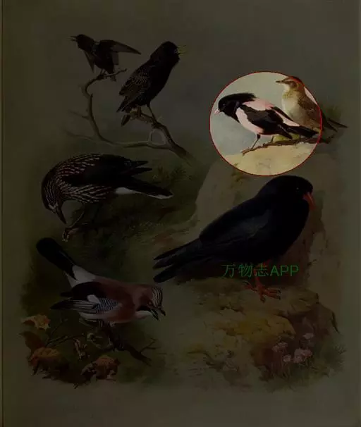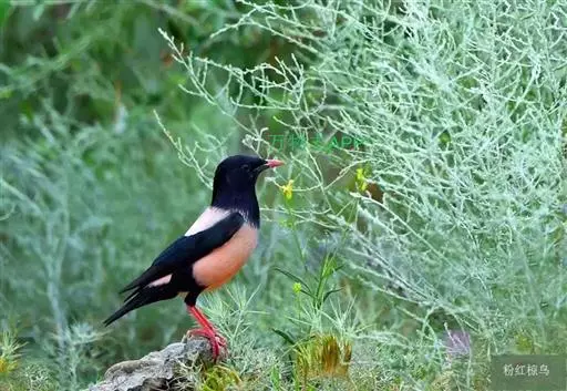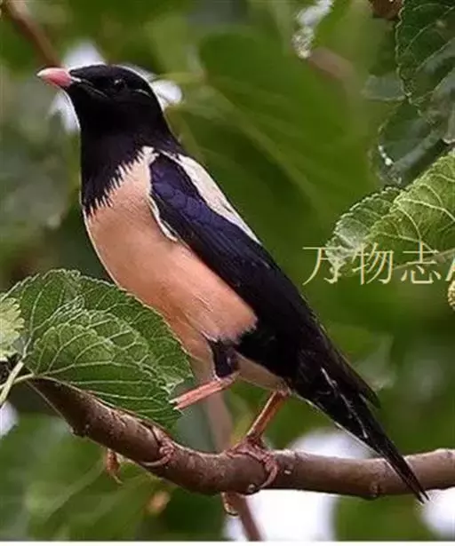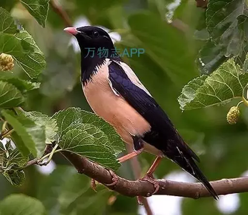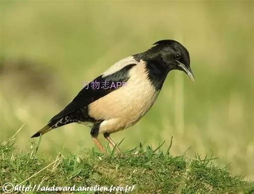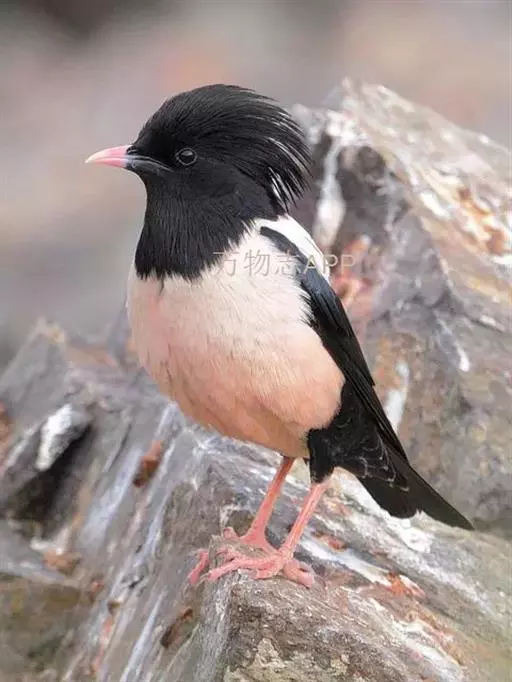 粉红椋鸟(学名:Sturnus roseus):中等体型,成鸟体长19-22厘米,体重60-73克,飞羽、尾羽为亮黑色,雌鸟与雄鸟毛色相似,但较黯淡。形似八哥,但背部及腹部粉红色,故称粉红椋鸟。余羽棕黑,十分可爱。雌鸟图纹相似但较黯淡。虹膜黑色;嘴粉褐色;脚粉褐色。飞行时发Ki-ki-ki的叫声,也有平淡的shrr声。群鸟进食时发出卷舌音chik-ik-ik-ik的叫声。