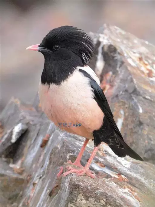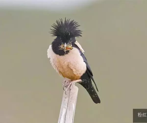 粉红椋鸟是雀形目椋鸟科粉红椋鸟属鸟类。头顶具紫色羽冠;头部、颈、颏、喉黑色具蓝紫色金属光泽;背和腹粉红色;两翅和尾黑褐色;虹膜暗褐色;嘴黄色或粉红色,上嘴基部黑色,冬季嘴为褐色;脚黄色。嘴较其他椋鸟短而钝,上嘴弯曲较明显;脚较粗壮,爪发达。粉红椋鸟分布于欧洲东南部、西伯利亚、西亚、印度和斯里兰卡岛等地区,在中国新疆西部和北部、西藏西部、澳门、台湾等地也能看到其身影。栖息于干旱平原、荒漠或半荒漠地区。常成群活动,鸣声嘈杂。主要在地面觅食,以甲虫、蝗虫、毛虫等各种昆虫为食,偶食植物果实和种子。繁殖期5—7月,营巢于岩壁缝隙、树洞中,每窝产卵4—6枚,卵白色或淡蓝色,孵化期13—15天。雏鸟晚成性,由雌雄亲鸟共同喂养。粉红椋鸟种群数量较少,已被列入中国国家林业局2000年8月1日发布的《国家保护的有益的或者有重要经济、科学研究价值的陆生野生动物名录》。
