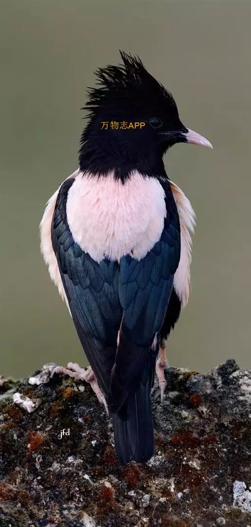 粉红椋鸟是椋鸟家族中的普通一员,中等体型,该物种鸟喙较其他的椋鸟短而钝,上嘴弯曲较明显,脚较粗壮,爪发达。雄鸟头部、颈、颏、喉和上胸黑色具紫蓝色金属光泽,有的喉具白色细纹。头顶羽毛长而尖,形成明显的羽冠。背、胸、腹及两肋为粉红,尾上和尾下覆羽黑色具白色羽缘,两翅和尾黑色具蓝绿色的金属光泽。冬季头和胸具皮黄色尖端,背部具淡褐色羽缘,使粉红色变得不显著。