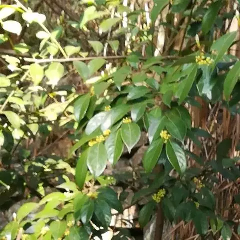 伞形花序腋生,总梗短或不明显,长一般不超过3毫米,生于混合芽中的总苞片绿色膜质,每总苞有3-8朵花。雄花花被片黄色,椭圆形,长约2.2毫米,内、外轮几相等,外面在背脊部被柔毛;雄蕊9,近等长,花丝无毛,第三轮的基部着生2具角突宽肾形腺体,柄基部与花丝基部合生,有时第二轮雄蕊花丝也着生一较小腺体;退化雌蕊细小,椭圆形,长约1毫米,上有一小突尖;花梗长约1.2厘米,密被白色柔毛。雌花花被片黄色,椭圆或倒卵形,内、外轮几相等,长约2毫米,外面在背脊部被稀疏柔毛或仅基部有少数柔毛;退化雄蕊长约1毫米,条形,第三轮的基部着生2个长约0.5毫米具柄不规则肾形腺体,腺体柄与退化雄蕊中部以下合生;子房椭圆形,长约1.5毫米,花柱长约0.3毫米,柱头盘状;花梗长3-6毫米,熟时黑褐色;果梗长1-1.5厘米。花期3-4月,果期7-8月。