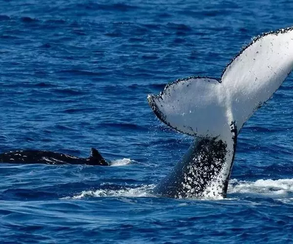 一般鲸类在潜水之前是不会升起尾巴的,但蓝鲸在潜水之前总是将尾巴露出水面,有时竟高高地跃出水面,然后迅速潜入30-40米的水中去寻觅食物。平时它也喜欢用尾鳍打水,这是一种有着多种用途和多种目的的消遣,可能是在做游戏,也可能是为了引起同伴的注意,或许是为了摆脱皮肤上的寄生虫的骚扰。
