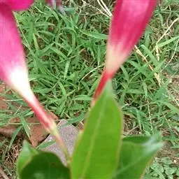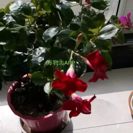 常绿藤本灌木。全株有白色乳汁,叶对生或3-4叶轮生,全缘,长卵圆形,长15-20厘米,宽5-10厘米,先端急尖,革质,叶面有皱褶,叶色浓绿并富有光泽。花腋生,花冠漏斗形,长10-15厘米,径约10厘米,漏斗状,花冠5裂桃红色,花色为红色、桃红色、橙红色,粉红等。花期主要为夏、秋两季。