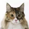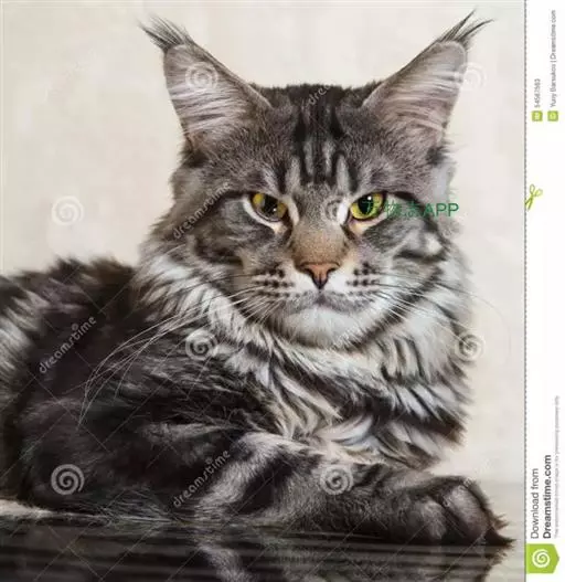 头部:缅因猫头大而圆,颧骨高,鼻梁长,稍凹陷,口呈方形、紧凑眼睛大, 缅因猫 椭圆形,眼色有绿色、金黄色、紫铜色等耳大基宽尖细,两耳间距宽,耳内有密生的长饰毛,并与体毛相衬。