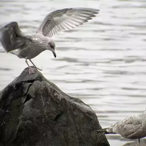灰翅鸥,夏羽头、颈、腰、尾白色;肩、背和翅上覆羽鸽灰色。冬羽和夏羽相似,但头和颈具淡褐色纵纹,有时…