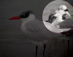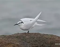 鸥嘴噪鸥,中型水禽,体长31~39厘米。夏羽额、头顶、枕和头的两侧从眼和耳羽以上黑色。背、肩、腰和…
