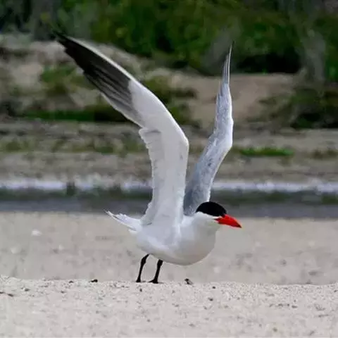 鸥嘴噪鸥,中型水禽,体长31~39厘米。夏羽额、头顶、枕和头的两侧从眼和耳羽以上黑色。背、肩、腰和…