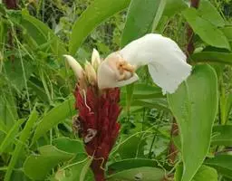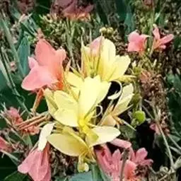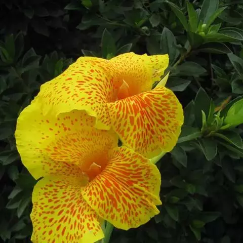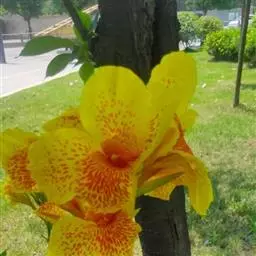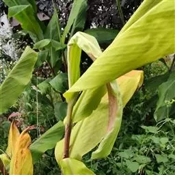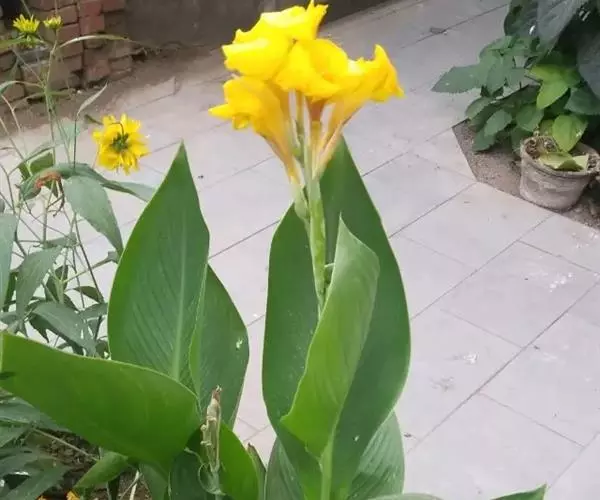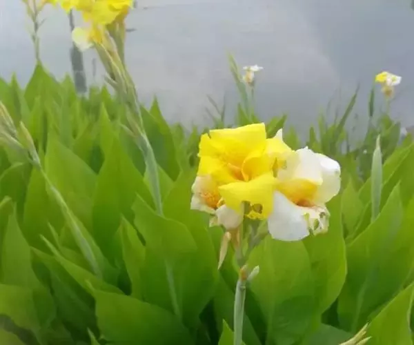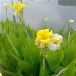 黄花美人蕉(学名:Canna indica L. var. flava Roxb.):多年生草本植物,高可达1.5米,全株绿色无毛,被蜡质白粉。具块状根茎。地上枝丛生。单叶互生;具鞘状的叶柄;叶片卵状长圆形。总状花序,花单生或对生;萼片3,绿白色;花冠、退化雄蕊杏黄色与正种美人蕉不同。唇瓣披针形,弯曲;蒴里,长卵形,绿色,花、果期3-12月。