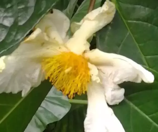 花顶生,单花,直径7-10厘米,近无柄;苞片3片,紧贴着萼片;萼片5片,倒卵形,长1-1.7厘米,宽2厘米,外侧有茸毛,脱落;花冠白色,长4-4.5厘米,花瓣6-8片,倒卵形,长3-4厘米,宽1-2.2厘米,基部连生约4-5毫米,最外侧1-2片近离生,基部稍厚,革质,背面有毛;雄蕊长1.2厘米,多轮,无毛,外轮花丝与花瓣连生约5毫米;子房有毛,花柱3条,长1.5厘米,有毛。胚珠每室4-6个。蒴果球形,直径6-10厘米,果皮厚1-2厘米,干后疏松多孔隙,3室,每室有种子3-5个。 花期10-12月,果实秋后成熟。