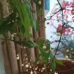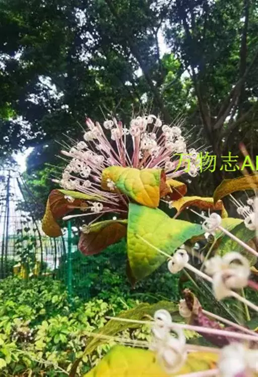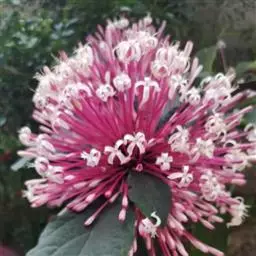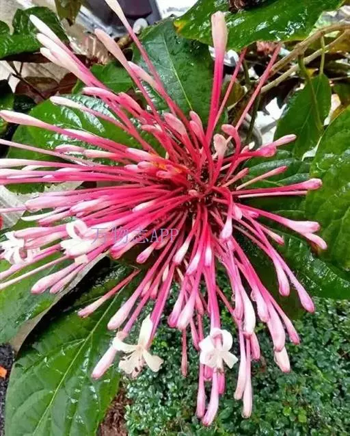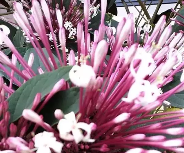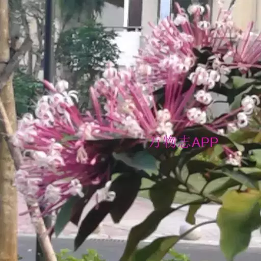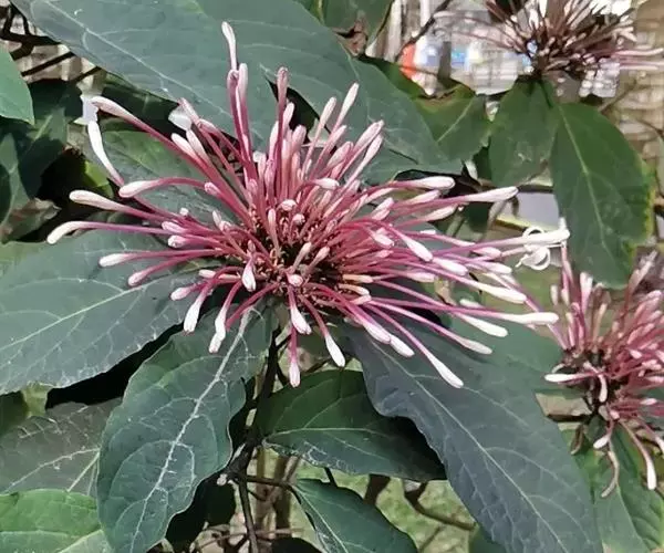 烟火树6-11月花开不绝,花期长达半年之久。花顶生、长筒形、聚散状、花序密生、花筒紫红,前端炸开5片洁白缤纷的长条形花瓣,好似繁星闪烁,仿佛是节日盛放的团团烟火。吐露的花蕊似金丝银柳一般,微风一吹弹跳起舞不停,花后的果实五彩缤纷。