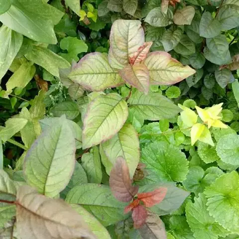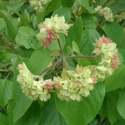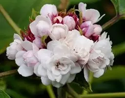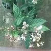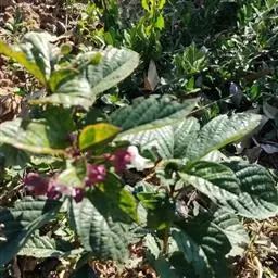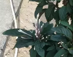 常绿灌木。幼枝方形,墨绿色。叶对生,长椭圆形,先端尖,全缘或锯齿状波状缘,叶背暗紫红色。花顶生,小花多数,白色5裂,外卷成半圆形。果实椭圆形。